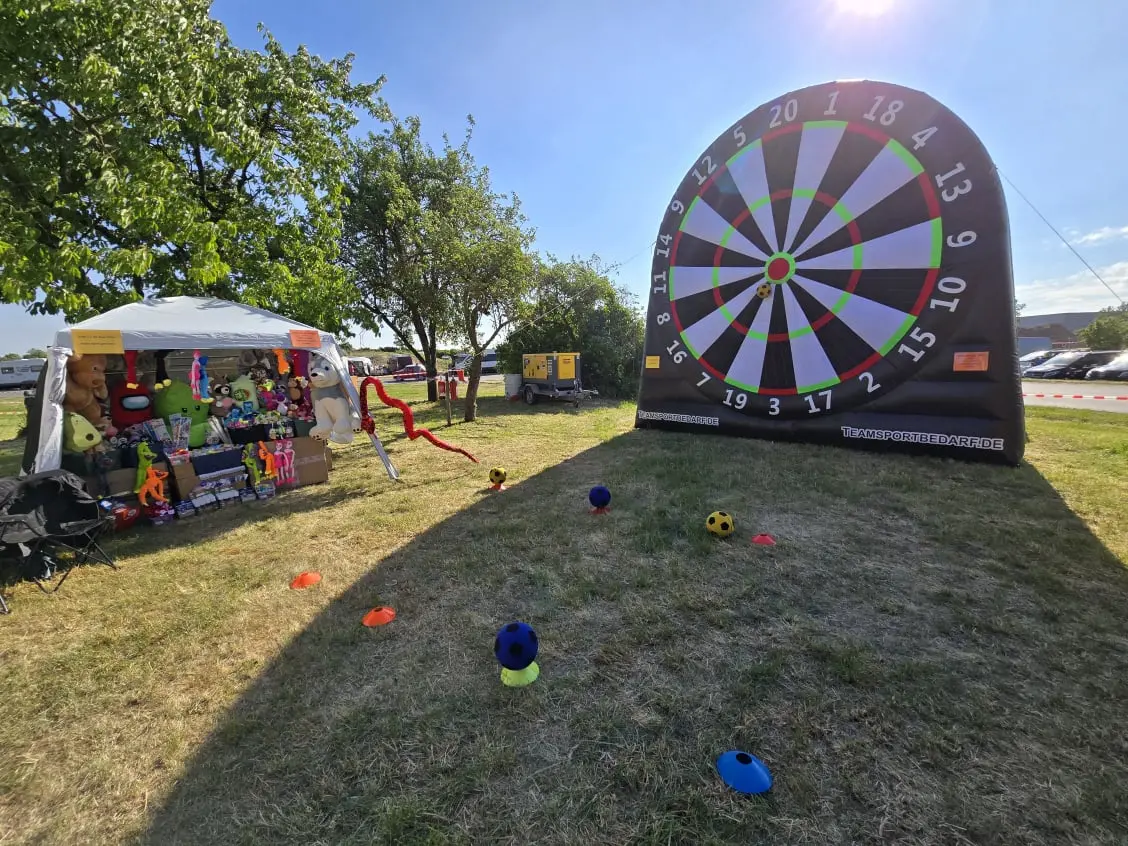 Die XXL-DartScheibe misst 5,00m x 0,50m x 5,00m und wird mit 230 V betrieben. Dazu bieten wir einen Pavillon und einen kleinen Anhänger.